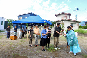 下さいました。工事に携わる業者さんも参加して、お施主様の地鎮祭をお祝いしました。