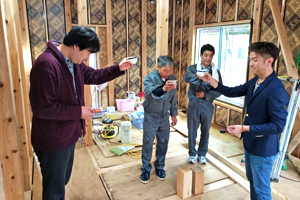 棟梁がお神酒を建物の四隅にまき、そのお神酒で上棟をお祝いしました。お施主さまから、