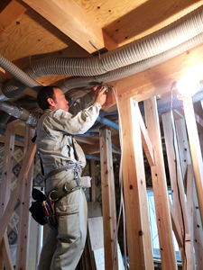 室内の木工事です。断熱、気密、耐震、制震性能を持つスーパーウォールパネルがはめ込まれています。壁が仕上がると分からなくなる部分ですが、大工さんや設備屋さんがきちんと正確な工事をしています。