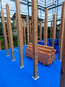 柱がどんどん立っています。雨の心配があったのでブルーシートで養生をしました。
