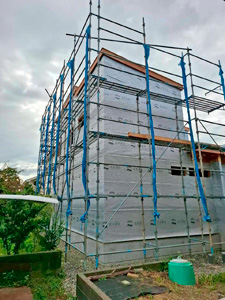 家のカタチが見えてきました♪雨水の侵入を防ぐタイベックシートを貼りました。