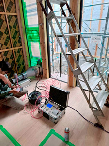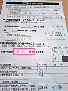 高断熱・高気密住宅には欠かせない大事な『気密測定』です。家全体でどのくらいの隙間があるか専門方に測定をしてもらいます。S様邸の相当隙間面積=0.13㎠/㎡。とても良い結果となりました 💡 すご~い!