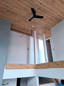室内では、壁下地工事を行っています。火に強く音を通しにくい石膏ボードを張り、表面をパテ打ちしてサンダー処理し平滑にします。
