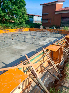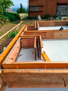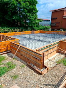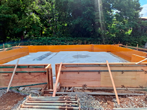 養生期間を経て耐圧盤コンクリートが完成しました。今日は、基礎立ち上がりコンクリートの型枠を作っています。