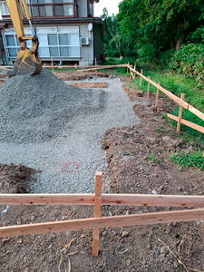 新築工事が始まっています。敷地に対する建物の位置や柱・壁の中心線、水平、高さなどの「基準」を表すために杭を用いて仮設します。