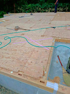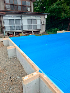 基礎天端に土台伏せをし、基礎断熱と構造用合板を張ります。合板の上に雨養生のためブルーシートを張りました。