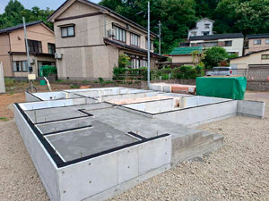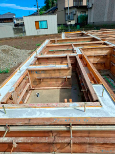 捨てコンクリートを打設しました。基礎の位置の正確な墨出しと、型枠を固定するために平滑で安定した基盤をつくるために打設します。