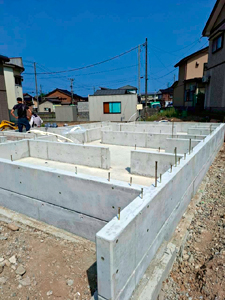 基礎全体に砕石敷き込み、機械を使って転圧をかけます。密度を高めて地盤を強固にします。