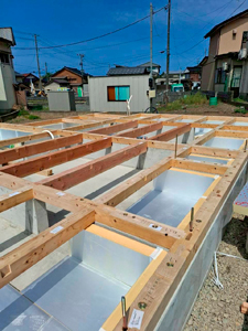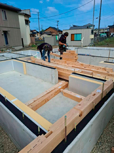 土台となる木を伏せてアンカーボルトでしっかりと基礎に固定します。基礎に断熱材もしっかりと施しました。