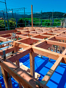 いよいよ柱や梁が組まれていきます。今日は快晴ですが、後日の雨に備えて床の構造用合板にブルーシートで養生しました。