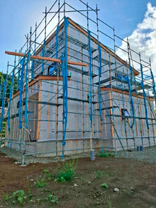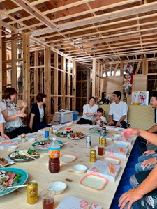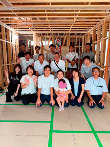 9/11、糸魚川市で上棟式が行われました。棟梁が建物の四隅にお神酒をまいて清めます。棟上げが無事に完了したことに感謝し、今後の工事の安全と建物の完成を祈願しました。I様、たくさんのお気遣いありがとうございました!