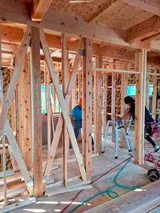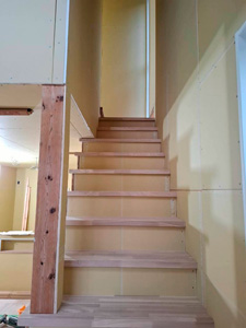 外壁下地工事です。透湿防水シートを貼り、その上から胴縁材を付けていきます。室内も着々と大工さんの仕事が進んでいます。