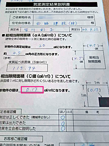 省エネ住宅を造る上で大切な気密測定。I様邸の相当隙間面積C値は、0.17㎠/㎡。とっても気密性の高いという結果になりました。