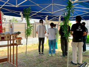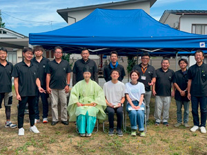 お盆明け、地鎮祭を執り行いました。斐太神社の神主さんに来ていただき、みんなでこれからの工事と土地・建物の安全を祈願しました。