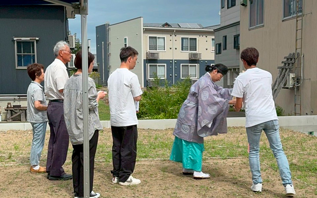 お施主様のご両親も参加して下さいました。お供えした塩やお神酒などを土地の四方にまいて清めます。