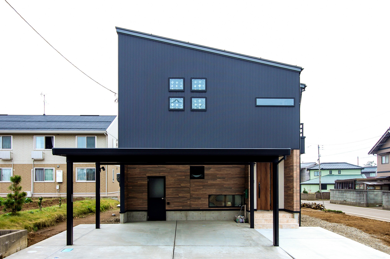 黒のガルバリュウム鋼板×木目×ブラウンのタイルの外観。