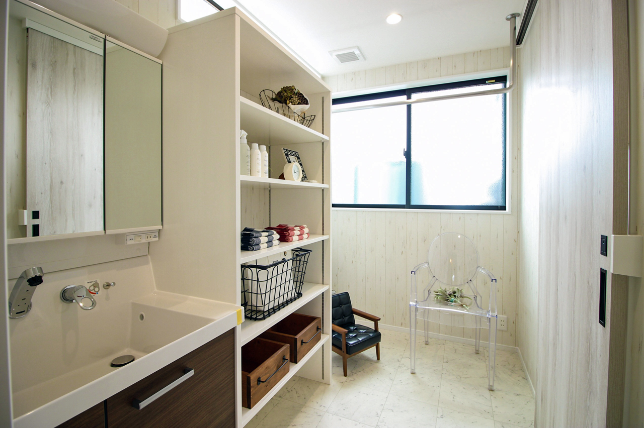 洗面化粧室には、ランドリースペースも設けています。とっても明るくてきもちいい!