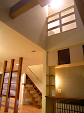 一歩上がると左に大開口を有する大空間のリビングが、より一層空間の広がりを助けます。リビング吹き抜けからそそぐ光は、2Fリビングホールを乱反射し、その光が階段から戻ってきます。閉じられているファザードから実は大量の光を取り込んでいて、その光を更に室内で有効に活かす空間作り。ここに「光を取り込む家」が完成しました。