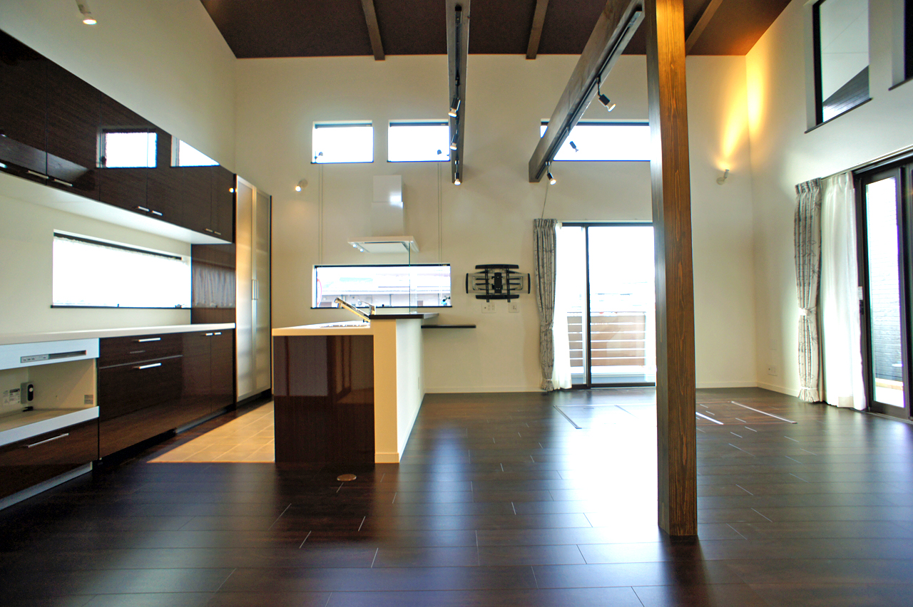 ダークブラウンの床材を天井に用いて、落ち浮いた雰囲気に。縦長LDKの空間を、梁や横スリット窓、ペンダントライト、4.5畳スペースなどで、バランス良く調和しています。