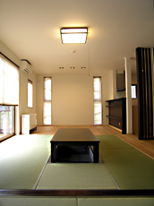 新しい形の和風住宅。お客様も多数来られるので、「ワッ!」と驚くお出迎えが出来る様、アプローチから玄関ホールの土間まで、落ち着いた中にも新しい空間構成を考えた。更に、ホールから仏間、リビングとのつながりを、どういった位置づけにして接続させるか等、お施主様と何度も打合せを行い、今回この様な形で完成する事が出来た。