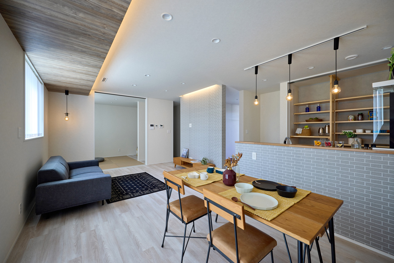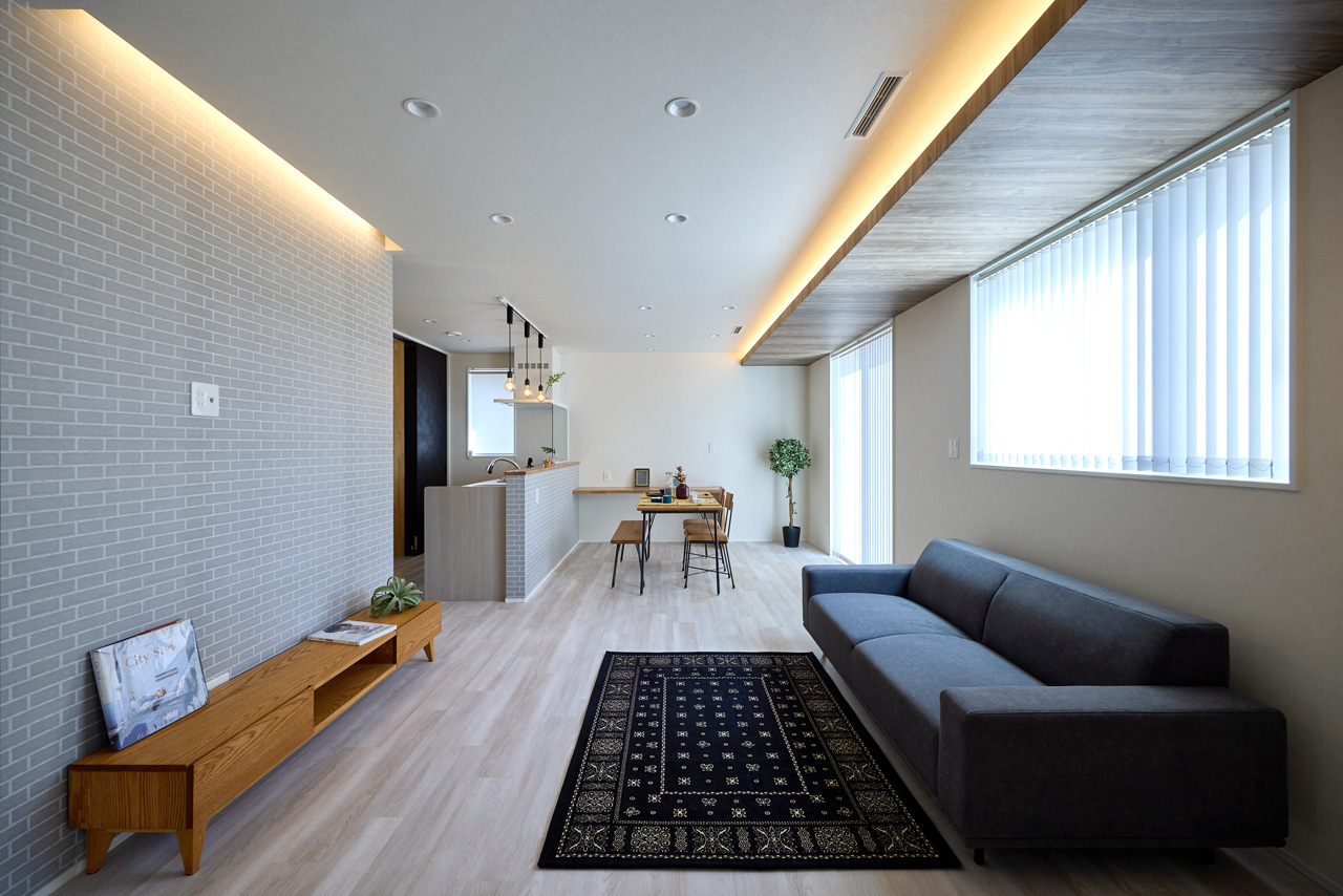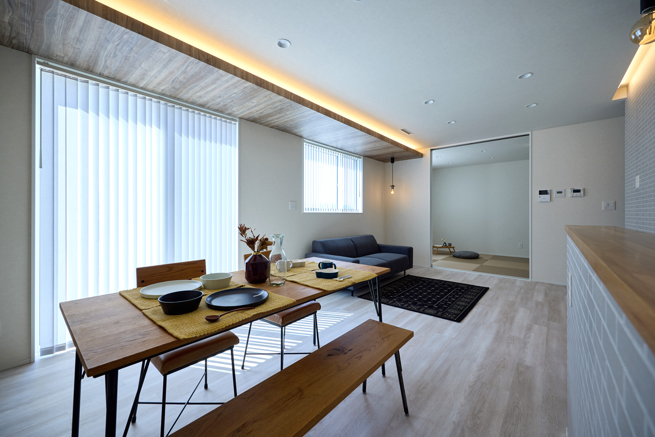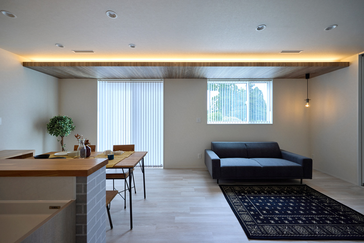 天井を照らすコーブ照明がアクセントのリビングダイニング。