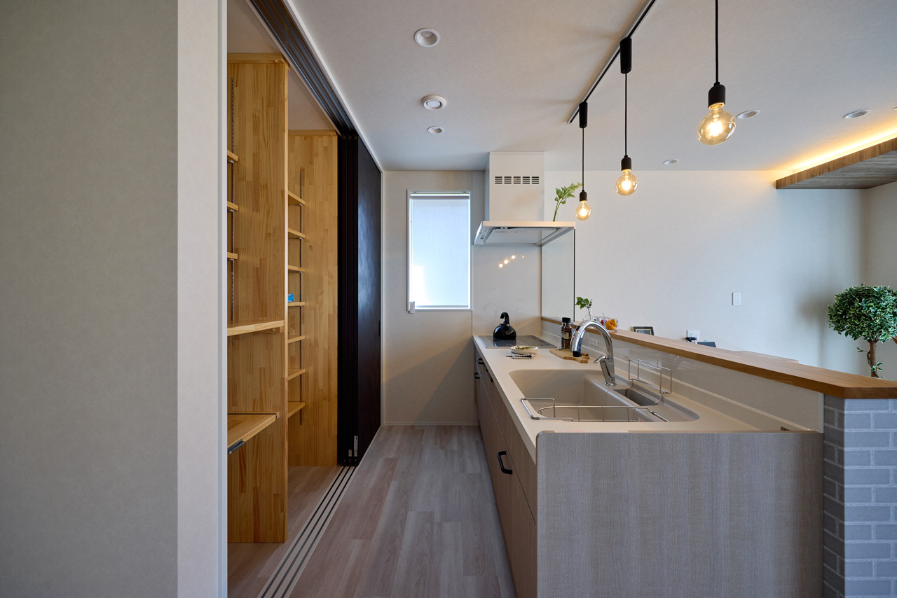キッチンはLIXILノクト。背面収納は、3面引き戸のたっぷり収納。家電を置いたり食器や食品を置いたりできます。