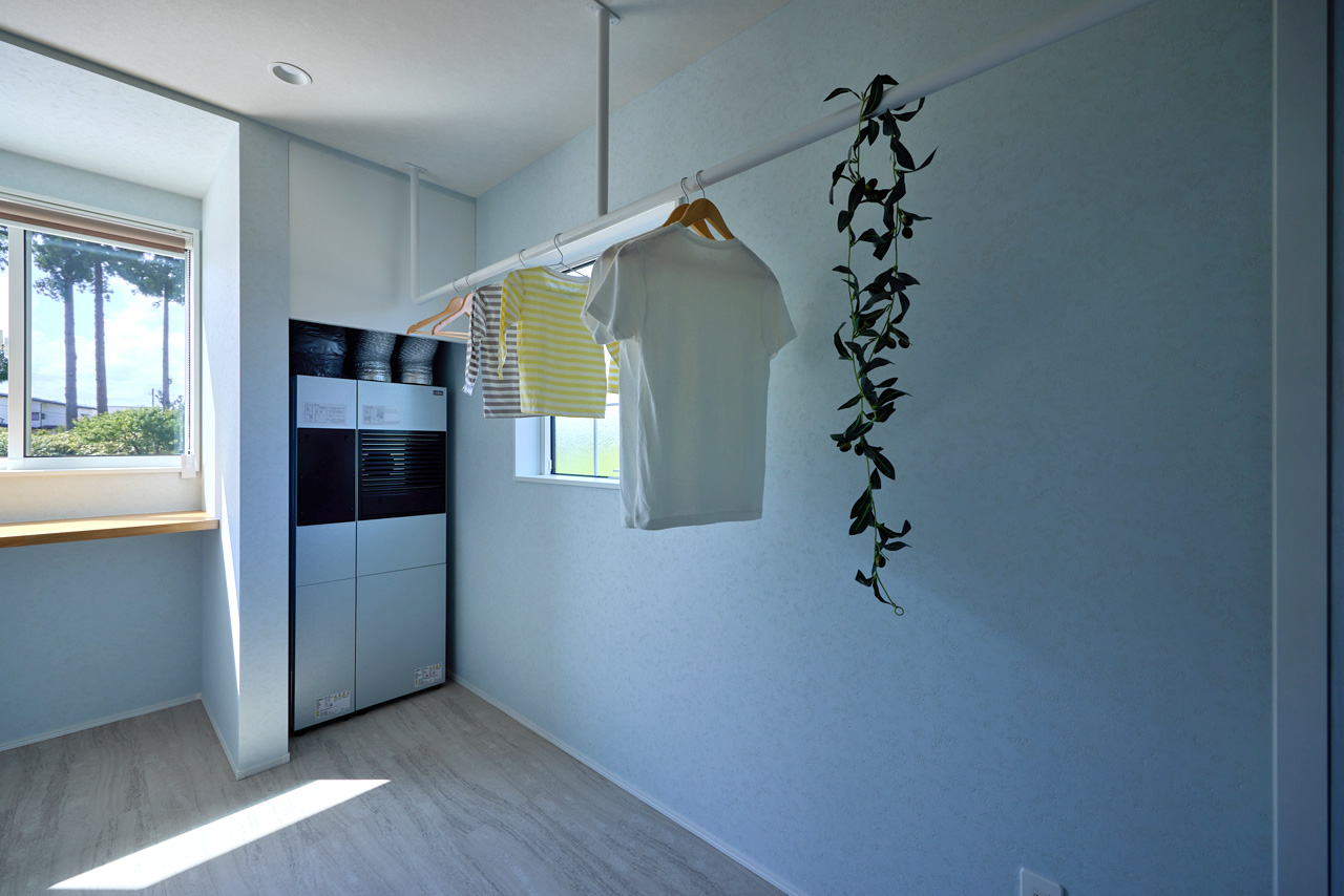 南側のランドリールームは、たくさん洗濯物が干せて、カウンターでは畳んだりアイロンをかけたりできます。