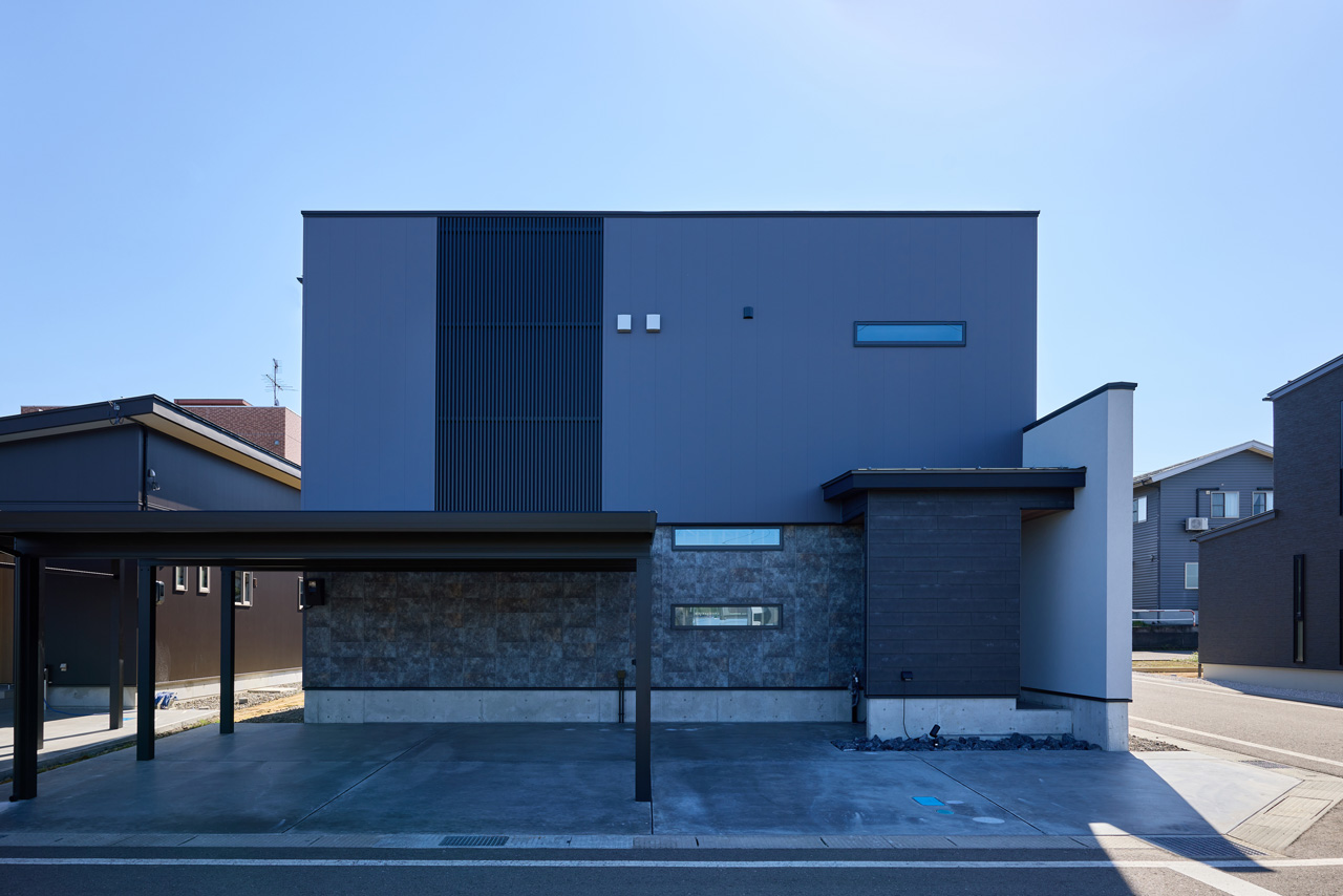 セメント外壁材SOLIDO、塗り壁のジョリパット、LIXILコートラインを使いクールでホテルライクな外観。