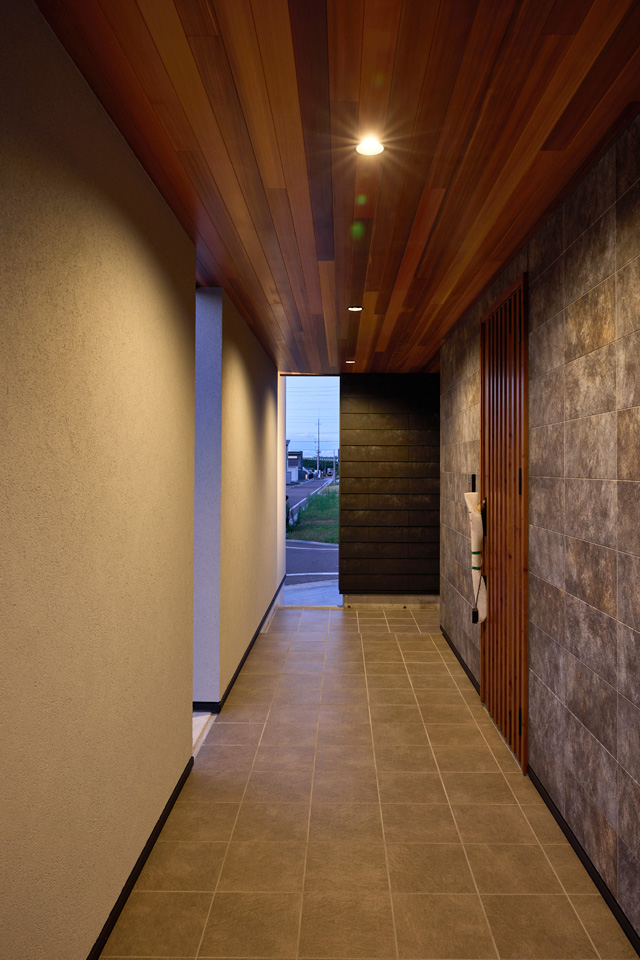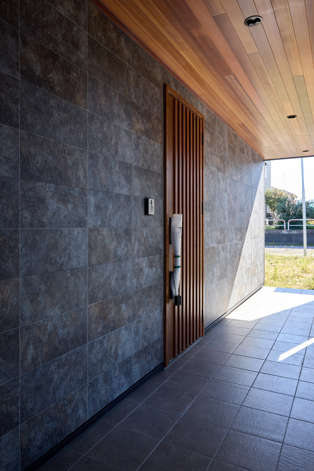 ピロティ風な玄関アプローチ。レッドシダーの天井とタイル、木調玄関ドアが上品な空間をつくりました。