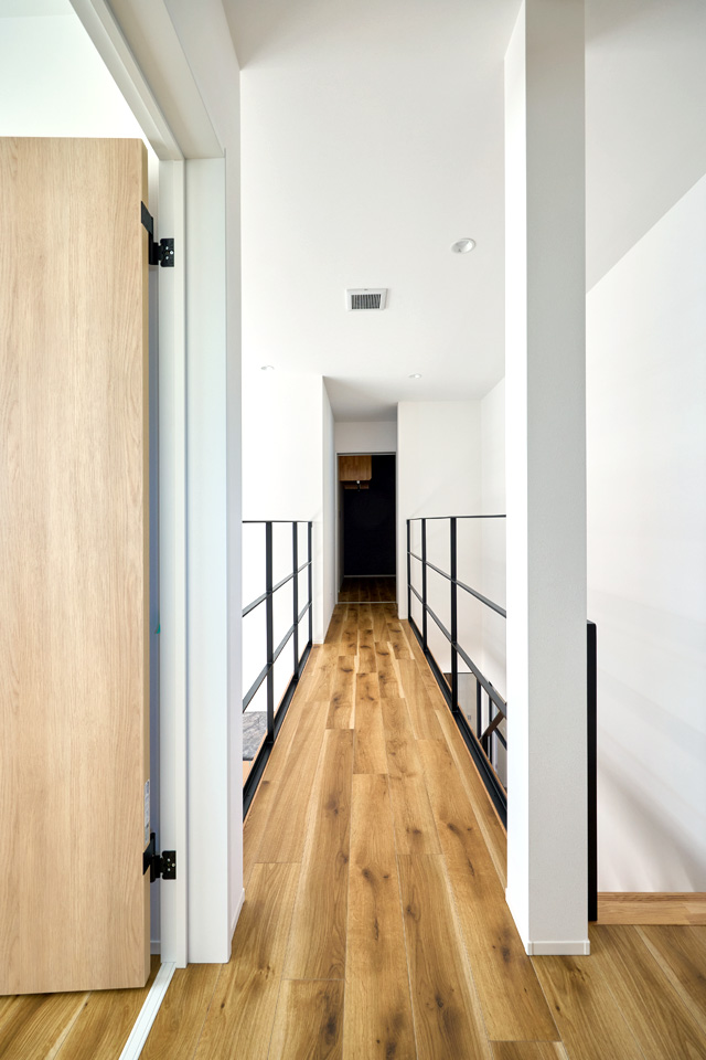 階段とリビングの間に位置するブリッジ風の2階廊下。