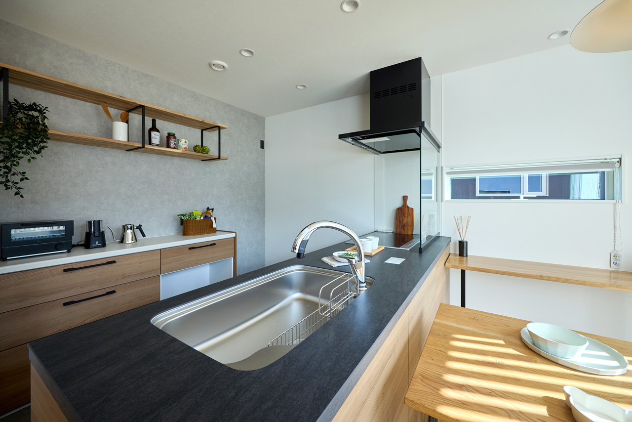システムキッチンは、リクシルのリシェル。ワークトップは熱やキズ、汚れに強いセラミック。