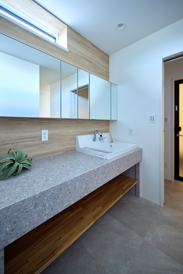 2階に配したパウダールーム&ランドリールーム、脱衣室、バスルーム。