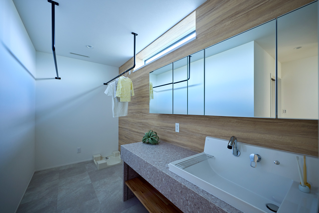 4帖の広さの洗面化粧室には、たっぷり干し物を干すことができます。1800mm幅の広い造作洗面化粧台は収納も充実。
