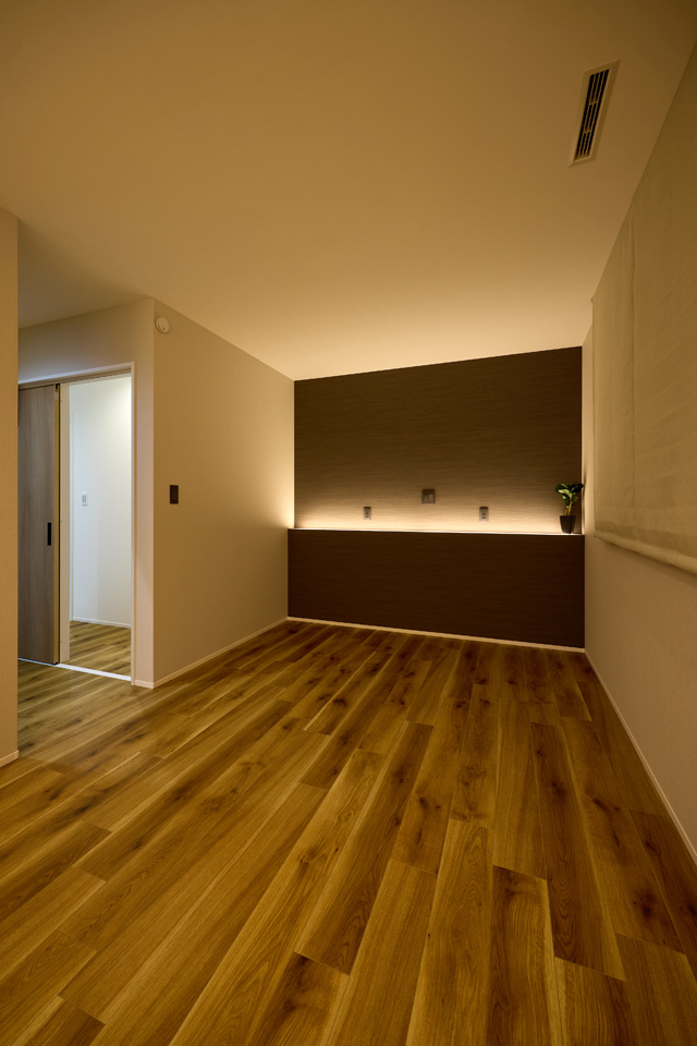 ウォークインクローゼットとつながる寝室。腰壁に間接照明を施しました。