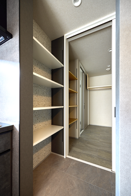 キッチンの並びに、パントリーと家族みんなで使うウォークインクローゼット。