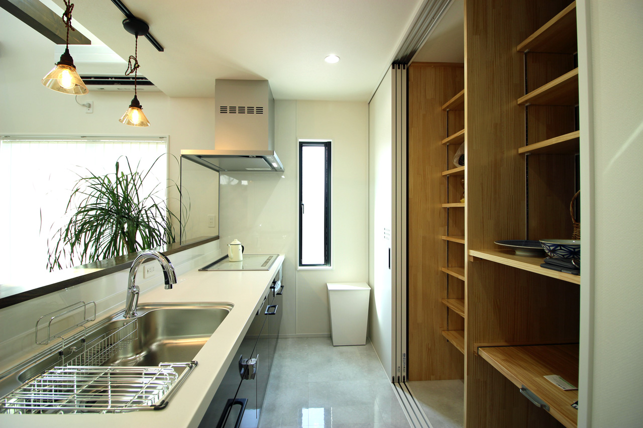 対面型のキッチン。天井まである背面収納は、かくせる&見せれる使い勝手の良いたっぷり収納です。